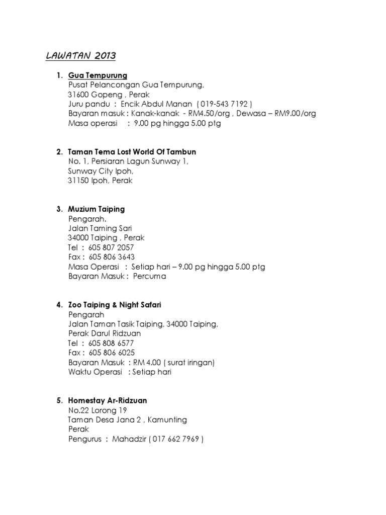 Zoo Taiping Night Safari Jalan Taman Tasik Taiping 34000 Taiping Perak Darul Ridzuan Malaysia. Waktu operasi Zoo Taiping dan Night Safari. GARIS PANDUAN PERANCANGAN PENGENALPASTIAN BAGI PEMBANGUNAN SEMULA KAWASAN BROWNFIELD 23.